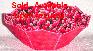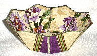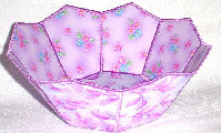 | These bowls are constructed of two coordinating pieces of fabric that are fused to a thick interfacing, called Timtex. They are then cut and sewn into different shapes. I sew the bowls with a high quality poly neon or metallic thread. They are very durable, machine washable, and reversible! You can used them for almost anything, or display them as a decorative pieces. These 8-sided bowls measure approx. 11" x 6" x 4 1/2"H. The price is $30.00. | ||||||||||||||||||||||