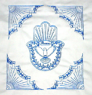 This 100% cotton Challah cover is white, and is embroidered with a Hamsa, with Peace, and a dove surrounded by olive branches. Embroidered matching corners "frame" the Hamsa. Your choice of color of embroidery. Measures 18" x 18". Machine wash and dry. Price: $40.00 Designed by 4-Hobby.com |