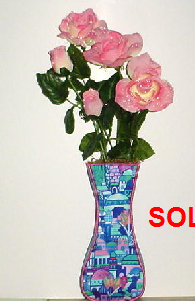 These are my latest works with fabric. The vases are fabric and made the same way my bowls are, except in different shapes. 100% cotton fabric, the vases are approximately 3 1/2 inches square at the bottom and 10 inches high. The arrangements are made with silk flowers. Other fabrics, designs, specific flowers, and colors available for year-round gift giving. They also make great center pieces for holidays or events. Please contact for special orders and pricing. Special pricing on bulk orders. Price for items shown: $25.00 each Please note: SOLD items are not in stock but can still be made for you. |