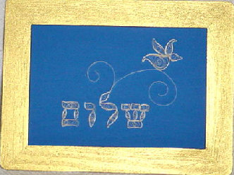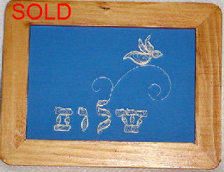 | Quilling is paper filligre. It is the art of curling very thin strips of paper, and molding them into a specific shape. They are then glued together in a special way to create a design or picture. These designs can last a lifetime. Avoid keeping them in sunlight and heat. These are quilled Shalom with Peace Dove, on 5"x7" blue painted background, in a stained wood or gold painted frame. $25.00 each. | ||||||||||||||