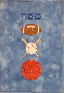 | Sports symbols on medium blue cotton batik. | |||||||||||||||||||