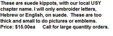 | Kippot -- These are just samples for you to see my embroidery on Eileen's hand-crocheted kippot. To see a wonderful selection of custom made, hand-crocheted kippot, visit: | ||||||||||||||||||||
