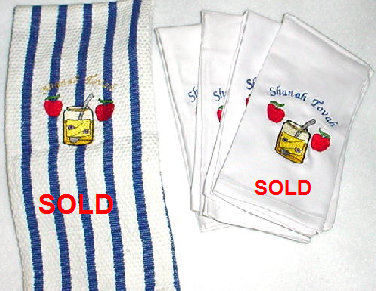 Shanah Tovah 100% cotton "chef-size" kitchen towels. $20.00ea 2/$35.00 100% cotton table napkins. $15.00ea 4/$50.00 8/$85.00 |