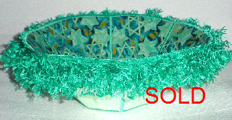 Gold Stars on Teal with a very light teal Batik; Teal fun-fur trim Size: 11" x 5" x 3 1/2"H Price: $40.00 |