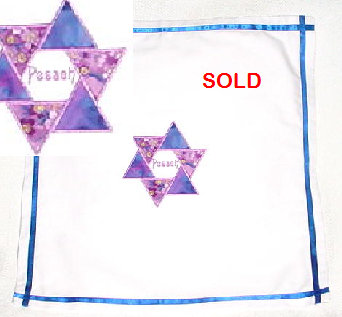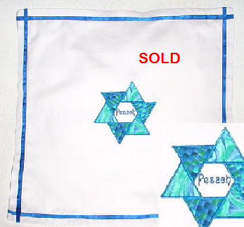| These Matzah Covers are high quality 100% cotton (white). The stars are appliqued with 2 coordinating cotton fabrics and embroidered in the center. They are trimmed with satin ribbon. They measure 20" x 20". Price: $30.00. Your choice of colors on white. Not all varieties shown. | ||||||||||||||||