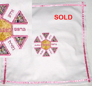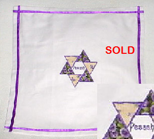 | These Matzah Covers are high quality 100% cotton (white). The stars are appliqued with 2 coordinating cotton fabrics and embroidered in the center. The one on the right has the triangles and center appliqued, and the embroidered Hebrew words are the required foods on the Seder plate. They are trimmed with satin ribbon. They measure 20" x 20". Price: $30.00. Your choice of colors on white. Not all varieties shown. | ||||||||||||||||