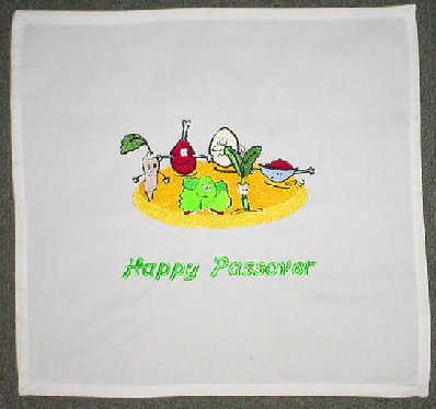 This matzo cover is the perfect item to have at children's Passover table! The design and greeting is embroidered on100% high quality cotton and measures 17" x 17". Machine wash/dry. Price: $40.00 |