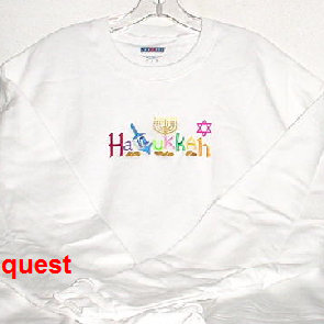 These embroidered sweatshirts also make a great gift or to wear in celebration of Hanukkah with their festive colors. They are made of 50%cotton/50%polyester, machine wash/dry. Your choice of color and embroidery design/monogram. All colors and sizes not shown. Also available for toddlers. SPECIAL PRICING ON ALL ORDERS OF HANUKKAH ITEMS PLACED BEFORE 10/1/10 Please call or email for more information. |