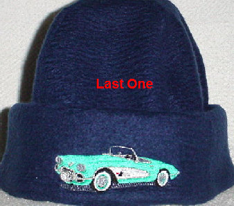 '60 Vette - Navy blue hand-crafted fleece hat with embroidered car in stock turquoise and detailing Price: $21.95 |