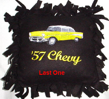 | '57 Chevy - Hand-made black fleece pillow with embroidered car in stock yellow with detailing and lettering. 16"x16" without fringe. Price: $49.95 | ||||||||||||||