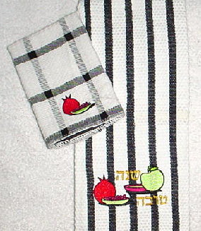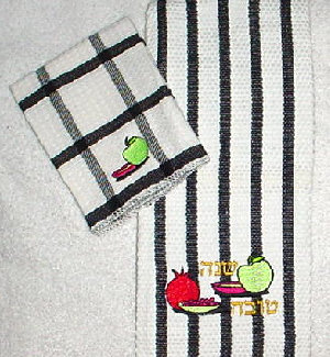 This set consists of a black and white striped chef-sized thick cotton waffle weave kitchen towel with coordinating dish towel . It has a green apple with honey dish and a pomegranite and bowl. It reads Shanah Tovah in gold. I will not split the set. Price: $15.00 per set |