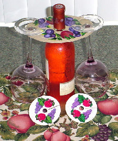These beautiful items will enhance any table setting. The runner is 100% cotton with braided trim and measures approx. 40" x 14". Price: $30.00 The fabric bowls-reversible and machine washable-are backed with a matching green leaves fabric. They come square or round. Price: $30.00ea. When purchased with the matching runner: $55.00 Wine Set comes with carved wood and hand painted grapes and apples to match runner fabric, and includes 2 wine glasses and 2 lace embroidery (there is no fabric - only thread) stem coasters to match. $45.00 (Wine not included) Extra coasters available: $6.00ea 4/$20.00 Complete Set: 1 runner, 1 bowl, 1 Wine set - a savings of $20.00 - only $85.00 |