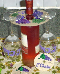 These beautiful items will enhance any table setting. The runner is 100% cotton with braided trim and measures approx. 40" x 15". Price: $30.00 The fabric bowls (not shown)-reversible and machine washable-are made of the same fabric. They come square or round. Price: $30.00ea. When purchased with the matching runner: $55.00 Also available: kitchen towel to hang from your stove. Topping is matching fabric and front half has appliqued wine bottles. $20.00 Wine Set comes with carved wood and hand painted "L'Chaim" and grapes to match runner fabric, and includes 2 wine glasses* also hand painted with "L'Chaim", and 2 lace embroidery (there is no fabric - only thread)stem coasters to match. $55.00 (Wine not included) Extra coasters available: $6.00ea 4/$20.00 Complete Set: 1 runner, 1 bowl, 1 towel,1 Wine set - a savings of $25.00 - only $110.00 *Painted glasses are not dishwasher safe! |