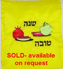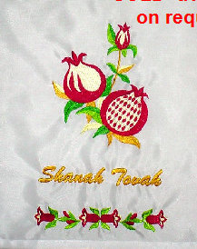 These beautiful Pomegranate designs make a very decorative and colorful yard flag. Also embroidered is Shanah Tovah. Price: $55.00 The full set of pomegranates will soon be available on tablecloths and napkins. I will only have a sample on my site because of the variety of sizes. Please contact me to preorder for the holidays. Pomegranate designs by 4-hobby.com |