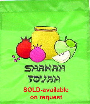 This Rosh Hashanah design shows pomegranites with a jar of honey, and an apple with an apple slice. It reads Shanah Tovah, and is embroidered on100% heavy weight nylon flag fabric, which will withstand all types of weather. It is also machine washable It measures 12"W x 15"H. Price: $45.00 |