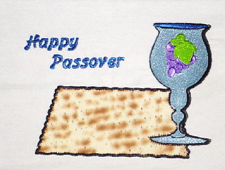 This embroidered Matzo cover has a wine glass with grapes and a Passover greeting. The Matzo fabric is appliqued in place. The fabric is 100% high quality cotton cloth. Cover measures approximately 17" x 17". Design is approximately 9" x 5.5". Price: $40.00 |