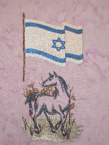 Israeli flag and horse - can be embroidered as larger separate designs. Fabric is a lilac cotton batik.