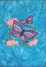 This embroidery-roses & butterflies- is on turquoise cotton batik. Design and fabric available in other colors.