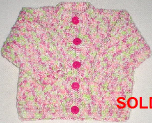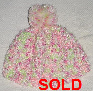 This afghan, hat, and cardigan are 100% acrylic, with variegated pink, rose, lime green, and white colors in shell crochet. The matching hat (size 12-18mos): $15.00 Blanket measures approx. 36"x47" : $55.00 Cardigan (size 12mos+): $40.00 Machine wash, cold water. Tumble dry, low setting, remove promptly. SAVE $25.00 when buy the set! Set price: $85.00 |