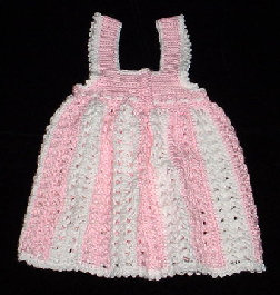This beautifully styled, lacey-look summer dress, was hand-crocheted with pink and white 100% acrylic baby yarn. The front has 2 attached buttons (for show) and a crocheted cording woven through the bottom yoke stitches to adjust for comfort, and tied in a bow, and a gathered bodice. The back yoke closure has 4 invisible (clear) snaps. The picot border does not continue under the arm to avoid any irritation. Will fit chest size up to 19". Length from top of shoulder approx 18". Size: 18mos+ Price: $55.00 |