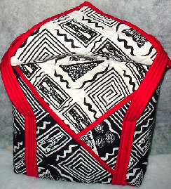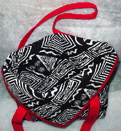 This is a very unique bag. After quilting and binding the fabric, it is folded and sewn together in a way that leaves you with a very roomy inside, large V-shaped pockets outside (front and back), that are covered with the flaps. Straps are also quilted. It measures approximately 15" x 15" x 31/2". Price: $60.00. |