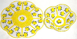 | Yellow Roses - The perfect accent to brighten a room! Bright yellow rosebuds on white. Doily measures approx. 10" in diameter. The bowl is approx. 7'' across the top, 2 1/2" deep, and a 3" base. Price: $85.00 | |||||||||||||||||