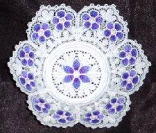 This lace bowl was done from a pattern by Zundt Design, Ltd. They are world-class, exquisite lace designers. Their works are very detailed. The flowers, although they appear blue, are lilac and purple near the center. The center itself and the lace surrounding the flowers is a silvery gray. The rest of the lace is white. The bowl measures 6" across the top, 2" deep, and 3" across the base. This bowl would perfect for a wedding or bridal shower. Price: $75.00