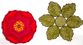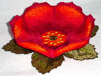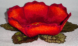 Rose - This bowl and doily is so radiant with its shades of red and orange, that I had to show it to you from different angles. Because of the type of threads used (remember there is no fabric in these), the pedals and leaves shimmer and shine with different angles of lighting. This is one rose that will last forever!! The bowl measures 7 1/2" across the top, 2" deep, and 6" across bottom. The doily measures 10" in diameter. Price: $135.00