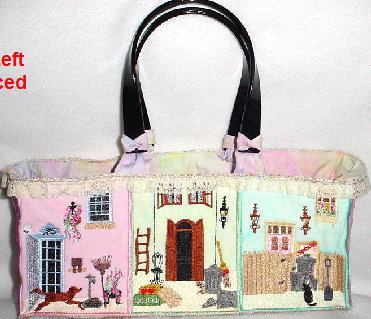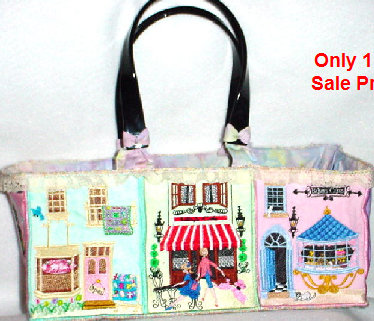 The Ultimate Bag - for the true shopper at heart. The front has 3 embroidered panels -quilt shop, cafe, and bakery. The back has 3 embroidered panels - the coordinating back of each store. On one side is an embroidered panel of a woman strolling down Park Lane. The other is an embroidered panel of a fabric shop. You can view these on the next page. The lining is a cotton batik with all the colors of the batik panels (pink, lilac, blue, mint green, and peach). Black acrylic handles, and a delicate lace trim around the top. The bag measures approximately 15"L x 5"W x 6"D. Regular Price: $185.00 This item has been sold.