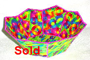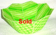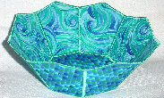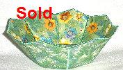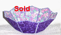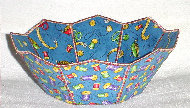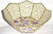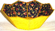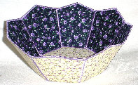 | These bowls are constructed of two coordinating pieces of fabric that are fused to a thick interfacing, called Timtex. They are then cut and sewn into different shapes. I sew the bowls with a high quality poly neon or metallic thread. They are very durable, machine washable, and reversible! You can used them for almost anything, or display them as a decorative pieces. These 8-sided bowls measure approx. 11" x 6" x 4 1/2"H. The price is $30.00. | ||||||||||||||||||||||