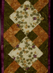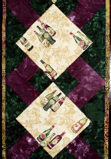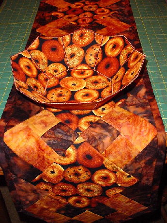 Bagels on Black table runner - Beautiful cotton and cotton batiks! Available in sizes 13" x 43" up to 13" x 81" Price: $65.00 & up Fabric bowl will hold up to a dozen bagels Price: $35.00 Also available: Grapes on the Vine Bottles of Wine |