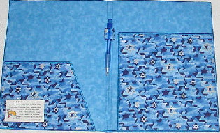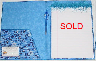 These portfolios are hand-crafted of 100% high quality cotton, fused to Timtex and have satin stitched edges. The inside lining is a coordinating fabric. On the right is a pocket to hold a legal pad. On the left is a smaller pocket to keep loose papers and notes. On the outside of this pocket is sewn a clear vinyl pocket to hold a business card or ID. In the middle is a sewn-in fabric ring to hold a pen. Measurements closed: 10"W x 13"H x 1/2"D; open: 20"W x 13"H. Portfolio comes with legal pad, pen, and ID card that reads: This Portfolio Belongs to. Decorative trims on pads are optional. Special orders taken for your choice of fabric design and for covers to be monogrammed or decorated with embroidery design. This cannot be done on an already completed item. There is an additional fee for special orders. The Judaic portfolios shown on this site are $40.00, unless otherwise noted.