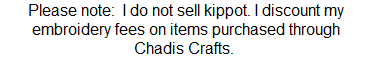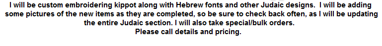 | Kippot -- These are just samples for you to see my embroidery on Eileen's hand-crocheted kippot. To see a wonderful selection of custom made, hand-crocheted kippot, visit: | ||||||||||||||||||||