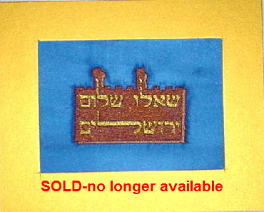 Can be used for Mizrach -- this one is embroidered on royal blue with gold metallic lettering, with gold mat. Area inside mat is 5"x7". Matted to fit 8"x10" frame or alone on a stand. Your choice of colors of fabric and mat. Price: $50.00 |