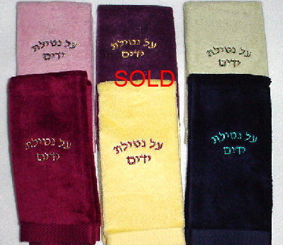 "Hand Washing" Towel -- Finger tip/guest towel embroidered with portion of prayer and metallic thread. Your choice of colors. Not all colors shown Not all colors available. Price: $12.00 |