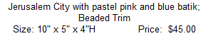 Pastel & Gold Stars on Teal with pink and blue batik Shades of pink and white Ladder Yarn Fringe Size: 10" x 5" x 4"H Price: $40.00 |