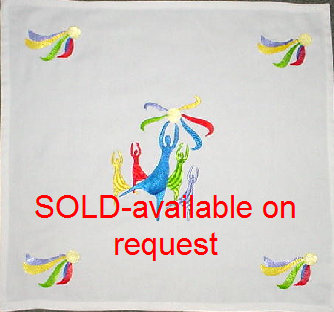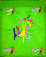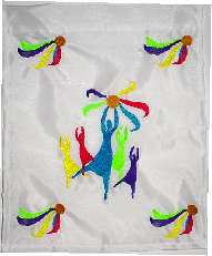 This Matzo Cover (left) is an embroidered, colorful silhouette scene of Miriam dancing with her timbrel (tambourine). It also has embroidered timbrels in the corners. This will make a beautiful accent for your Seder table. It measures 17" x 17". Price: $40.00 |
