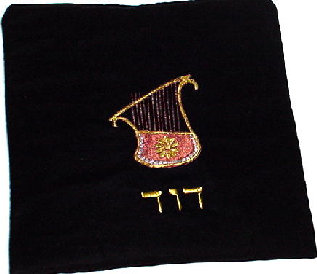 This tallit bag was a custom order. It is King David's Harp embroidered with gold, silver, and bronze metallic threads, on velvet. It has a thin fleece in between velvet and lining to add to body and save on wear. Zipper closure.