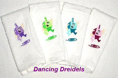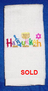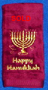 These embroidered guest towels make an excellent gift, or to have in your home for the holiday. They are made of 100% cotton and come in plush terry or velour. Your choice of colors. Not all colors shown. See more on the next page. Price: $15.00 metallic threads: $18.00 SPECIAL PRICING ON ALL ORDERS OF HANUKKAH ITEMS PLACED BEFORE 10/1/10. Please call or email for more information. |