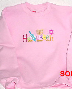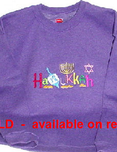 These embroidered sweatshirts also make a great gift or to wear in celebration of Hanukkah with their festive colors. They are made of 50%cotton/50%polyester, machine wash/dry. Your choice of color and embroidery design/monogram. All colors and sizes not shown. Also available for toddlers. SPECIAL PRICING ON ALL ORDERS OF HANUKKAH ITEMS PLACED BEFORE 10/1/10 Please call or email for more information. |