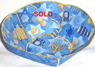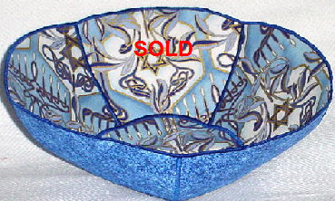 These beautiful large fabric bowls are perfect to display at holiday time. They make a great centerpiece. You can fill them with little dreidels and gelt or give as a gift. They are 100% cotton, machine washable, and reversible! They measure approximately 4 1/2" deep, 12" across the top, and 6" across the base. Price: $40.00 Others can be seen on the Judaic Fabric Bowls pages, and more added here when completed. |