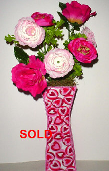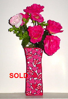 These are my latest works in fabric, just in time for Valentine's Day! Also, great for anniversaries! The vases are fabric and made the same way my bowls are, except in a different shape. 100% cotton fabric, the vases are approximately 3 1/2 inches square at the bottom and 10 inches high. The arrangements are made with silk flowers. Other fabrics, designs, specific flowers, and colors available for year-round gift giving. See more variations on the next pages. Please contact for special orders and pricing. Price for items shown: $25.00 Please note: SOLD items are not in stock but can still be made for you. |