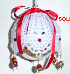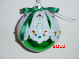 These ornaments are available in 2 1/2" and 3" (diameter). The covers are lace embroidery, have rhinestones or crystals attached. Some have beads hanging from them. There are 10 designs. I will post them as they are completed. The green one is 2 1/2", has green ribbon, and purple, yellow, and green rhinestones. Price:$20.00 The silver one is 3", red rhinestones, with hand-painted cloissone beads. Price: $22.00. Your choice of colors for ornament, lace, stones and beads. Other sizes available - limited to in stock only - $10ea Please contact for more information. |