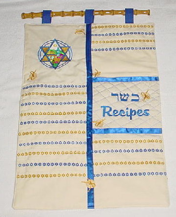 This embroidered wall hanging is the perfect addition to your Kosher kitchen. It has a beautiful and colorful embroidery of Jerusalem City inside the star with royal blue satin trim. 100% cotton, quilted, and eighteen pockets embroidered with royal blue and gold stars, to hold your favorite Kosher and holiday recipes. Satin trim, with wood button tacking. Your choice of color trim, embroidery design, and saying. Matching towels available (sold separately). Machine washable. Measures approximately 17"W x 23"H. Bamboo rod and 50 blank recipe cards included. Price for item shown: $65.00 |