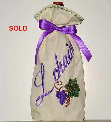 This wine bag is the perfect item to wrap your wine in. And what a great gift when you not only bring the wine, but give the bag as a gift too!! The bag is made of 100% cotton muslin, fully lined, embroidered with grapes on a vine and L chaim. It has an embroidered top-stitching and satin tie. The bag measures approximately 12"H and 4" in diameter. Machine washable Your choice of fabric/embroidery design. Price for item shown: $20.00 One left. |