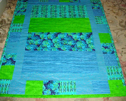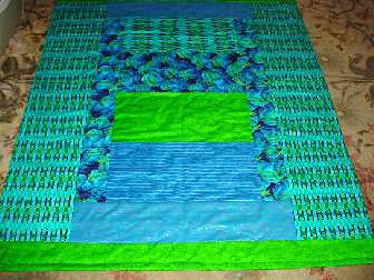 This quilt is shades of blue and green, with fish and the sea as a theme. Front view is on the left; back view on the right. It is 100% cotton and measures 31" x 41", and is machine wash/dry. Price: $65.00 |