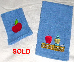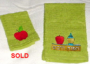 Above: These sets consist of kitchen and dish towels. (Cannot purchase separately) The ones above are "apple and honey". Left: This has the Shofar and says Rosh Hashanah. Right: This set is embroidered with an apple in a honey dish. All colors shown I will not split the set. Price: $15.00 per set Special pricing for the Holidays: Buy 3 sets, get 1 set FREE. | ||||||||||||||||||