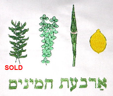 This Challah Cover is embroidered with the 4 species. It is 100% white cotton and measures 20" x 20" Matching table napkins available. Each napkin is embroidered with a different specie. Challah Cover: $40.00 Napkins: 4/$25.00 8/$45.00 Challah Cover with 8 napkins: $75.00 |