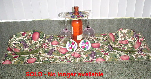 These beautiful items will enhance any table setting. The runner is 100% cotton with braided trim and measures approx. 40" x 14". Price: $30.00 The fabric bowls-reversible and machine washable-are backed with a matching green leaves fabric. They come square or round. Price: $30.00ea. When purchased with the matching runner: $55.00 Wine Set comes with carved wood and hand painted grapes and apples to match runner fabric, and includes 2 wine glasses and 2 lace embroidery (there is no fabric - only thread) stem coasters to match. $45.00 (Wine not included) Extra coasters available: $6.00ea 4/$20.00 Complete Set: 1 runner, 1 bowl, 1 Wine set - a savings of $20.00 - only $85.00 |