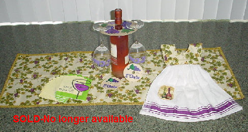 These beautiful items will enhance any table setting. The runner is 100% cotton with braided trim and measures approx. 40" x 15". Price: $30.00 The fabric bowls (not shown)-reversible and machine washable-are made of the same fabric. They come square or round. Price: $30.00ea. When purchased with the matching runner: $55.00 Also available: kitchen towel to hang from your stove. Topping is matching fabric and front half has appliqued wine bottles. $20.00 Wine Set comes with carved wood and hand painted "L'Chaim" and grapes to match runner fabric, and includes 2 wine glasses* also hand painted with "L'Chaim", and 2 lace embroidery (there is no fabric - only thread)stem coasters to match. $55.00 (Wine not included) Extra coasters available: $6.00ea 4/$20.00 Complete Set: 1 runner, 1 bowl, 1 towel,1 Wine set - a savings of $25.00 - only $110.00 *Painted glasses are not dishwasher safe! |